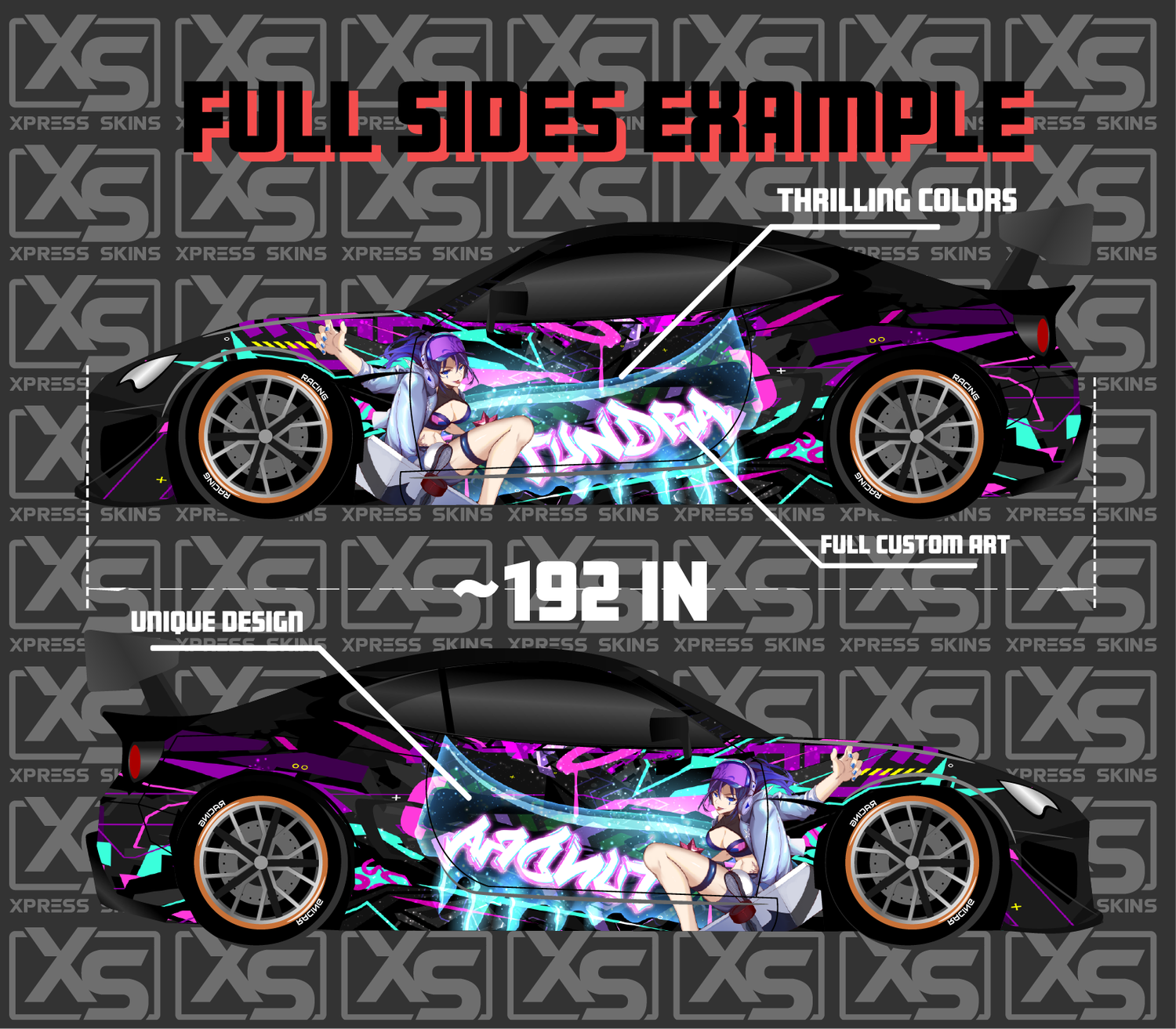 Transform your vehicle’s entire side into an anime masterpiece with our custom Full Sides Itasha Wraps by Xpress Skins Inc.! Ideal for anime enthusiasts and car lovers, these wraps cover both sides of your vehicle with vibrant, high-definition graphics featuring your favorite character. Each wrap includes artwork of one character, with options to add more characters for an additional fee, allowing you to create a fully personalized design that truly stands out. Choose from three service options: